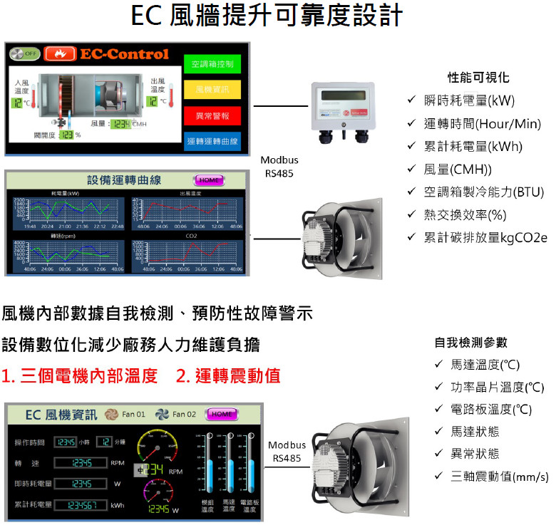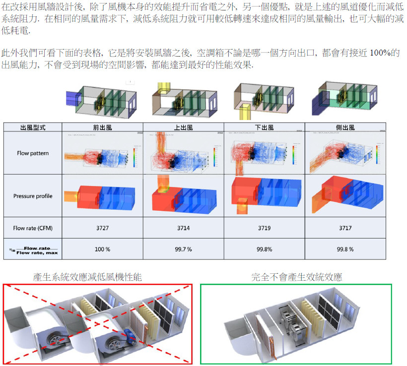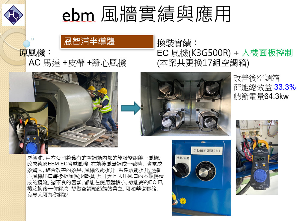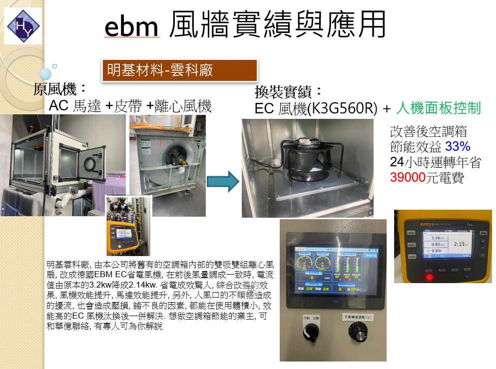 |   本公司經銷ebm-papst EC節能風機, 對於想為空調系統AHU/MAU節能省電. 原廠有完整的配套. 無論是單機運轉或是多風機組成風牆系統, 原廠的電腦選機會為客戶做出最高省電效益的模擬方案. 而風機可以採用標準數量或N+1備機, 因應風機維修停機時仍能有足量的設計, 加上多台風牆配置, 可有更多因應不同操作條件下的最佳效率能力, 都能增加節能的空間. 永磁直流變頻馬達的省電功效加上ebm原廠的最佳風機效率設計, 達到一般廠商無法達成的目標.體積小且簡易施工的特性,讓客戶更換的工作更無後顧之憂. 是值得推荐的好產品 請洽華億通風業務人員: 公司電話02-8512-2229   |